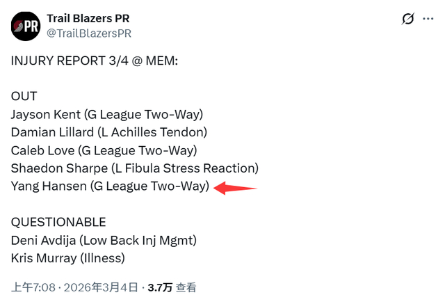 北京时间3月5日,开拓者官方在伤病名单上闹了个乌龙,他们把下放到发展联盟的杨瀚森,标注为“双向合同”。杨瀚森只是被下放,但他身背的还是一份NBA标准合同。数据显示,杨瀚森本赛季的年薪是442万美元,2026-27赛季是464万美元,这两年是全额保障。2027-28赛季是486万美元,2028-29赛季是746万美元,最后这两年是球队选项。开拓者官方的错误,很...